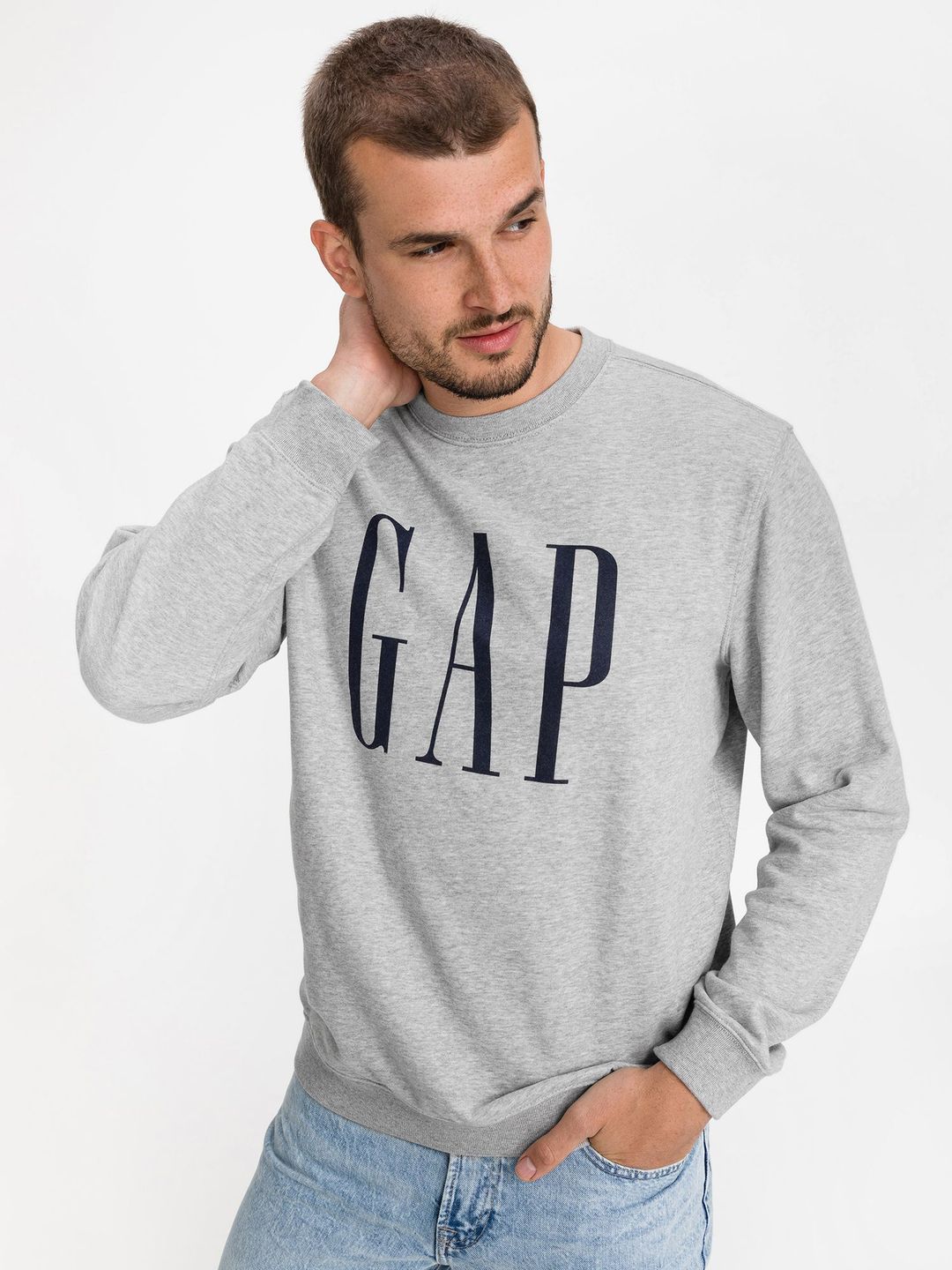Bluza męska wkładana przez głowę z logo GAP. Bluza jednokolorowa z długimi rękawami i okrągłym dekoltem przy szyi. Elastyczne ściągacze. Z domieszką poliestru z recyklingu.