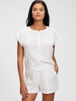 Damska bluzka muślinowa. Z okrągłym dekoltem. Zapięcie na guziki przy szyi. Krótkie rękawy i luźny krój. 100% bawełna.