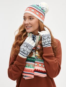 Czapka damska dzianinowa z pomponem. Kolorowy wzór żakardowy. W ofercie także szal.