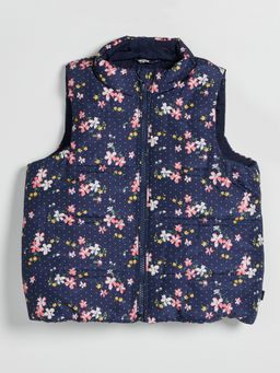 Kamizelka dziecięca pikowana watowana. Drobny wzór kwiatowy. Zapięcie na zamek błyskawiczny. Zamek z materiałową osłoną brody.
