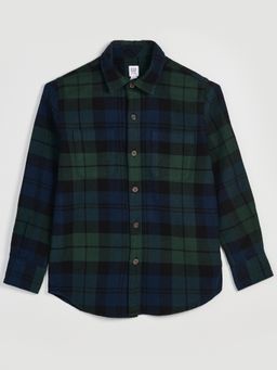 Koszula chłopięca w kratkę z przyjemnej flaneli. Długie rękawy z mankietami. Kołnierzyk i mała kieszonka na klatce piersiowej.