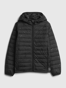 Lekka kurtka dziewczęca pikowana. Wzór błyszczących kropek na całej powierzchni. Kaptur i ukośne kieszenie. Zapięcie na zamek błyskawiczny. 100% poliester z recyklingu.