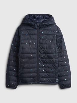 Lekka kurtka dziewczęca pikowana. Wzór błyszczących kropek na całej powierzchni. Kaptur i ukośne kieszenie. Zapięcie na zamek błyskawiczny. 100% poliester z recyklingu.