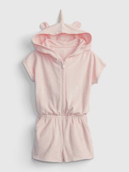 Rampersy dziewczęce w kolorze różowym. Zapięcie na zamek błyskawiczny. Krótkie rękawy i nogawki. Kaptur z uszkami i rogiem. Talia elastyczna i kieszenie boczne. Przyjemny materiał.
