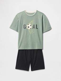 - Chłopięca piżama z miękkiej dzianiny składa się z koszulki i szortów.