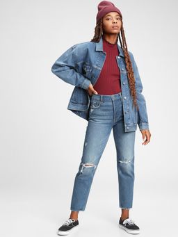Jeansy damskie GAP w kolorze średnim niebieskim. Bawełna z elastanem dla większego komfortu. Nowoczesna wysoka talia, zapięcie wyłącznie na guziki, szlufki na pasek, pięć kieszeni. Krój straight.