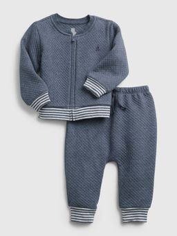 Komplet dziecięcy dwuczęściowy GAP w kolorze niebieskim. Bluza z zapięciem na zamek błyskawiczny. Haft z motywem misia. Spodnie dresowe z talią elastyczną ze sznurkiem ściągającym. Struktura waflowa. Ściągacze w paski.