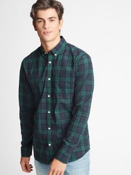 Koszula męska bawełniana GAP w kratę. Przyjemna koszula z długimi rękawami, klasycznym kołnierzykiem, zapięciem na guziczki i kieszonką. Krój lekko dopasowany.