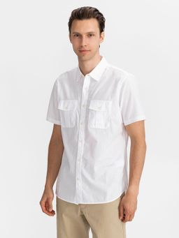 Koszula męska jednokolorowa GAP. Koszula z kołnierzykiem, krótkimi rękawami, dwiema kieszeniami z klapą na guzik i zapięciem na guzik. Kolor biały. 100% bawełna.