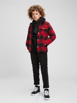 Kurtka chłopięca koszulowa GAP. Ocieplona sztucznym futerkiem typu baranek. Długie rękawy z zapinanymi mankietami. Kołnierz ze sztucznym barankiem. Zapięcie na zatrzaski. Dwie zapinane kieszenie z klapami na klatce piersiowej.