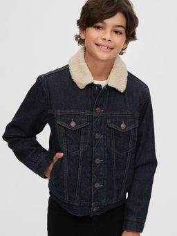 Kurtka jeansowa GAP na guziki z futerkiem pluszowym wokół szyi. Kołnierz z podszewką pluszową, zapięcie z przodu na guziki, kieszenie na guziki na klatce piersiowej i boczne kieszenie z wypustką. Paski na bokach do regulacji szerokości części dolnej i mankiety zapinane na guziki. Kurtka jest częściowo podszyta pluszem.