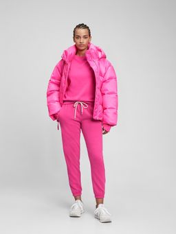 Spodnie damskie dresowe w kolorze różowym. Talia elastyczna ściągana sznurkiem. Ukośne kieszenie boczne. Nogawki wykończone ściągaczem. Materiał bawełniany z 10% poliestru z recyklingu.