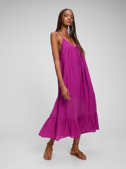 Sukienka damska o długości maxi. Miękka i przewiewna bawełna. Wąskie ramiączka typu spaghetti z wiązaniem na plecach. Luźny krój w kształcie litery A. Pod spodem krótsza halka. Dekolt w kształcie V z bogatym marszczeniem. Szeroka naszyta falbana.