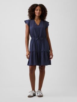 - Sukienka damska z gładko tkanej tkaniny z krótkimi rękawami z falbankami.