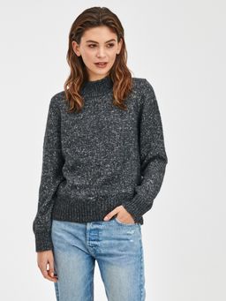 Grubszy sweter damski, biały melanż. Wysoki ściągacz elastyczny przy szyi. Przyjemny i ciepły materiał z domieszką poliestru z recyklingu. Dzianina maszynowa. Krótsza długość.