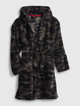 Pluszowy szlafrok dziecięcy GAP. Ulubiony wzór moro. Dwie duże naszywane kieszenie. Wiązanie w pasie. Szlufka do zawieszenia na szyi. Z domieszką 20% poliestru z recyklingu.