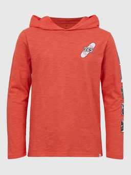 T-shirt chłopięcy z kapturem. Małe logo z przodu. Długie rękawy z napisem. Prosty krój, miękka dzianina bawełniana. Bez ściągaczy.