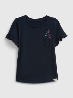 T-shirt dziecięcy GAP z krótkimi rękawami. Rękawy wykończone falbanką. Kieszonka naszywana na klatce piersiowej. 100% bawełna.