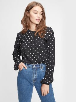 Jednokolorowy top damski w kropki. Elegancki luźny krój z falbaną. Długie rękawy z marszczeniem.
