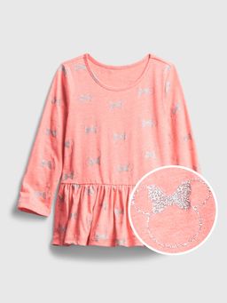 Jednokolorowa tunika dziewczęca GAP z falbanką i długimi rękawami. Tunika bawełniana. Mały nadruk srebrny Myszki Minnie na całej powierzchni.