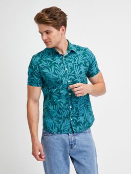 Męska koszula we wzory. Nowoczesny tropikalny wzór. Krótkie rękawy. Kołnierz i zapięcie na guziki. Zaokrąglone obszycie. Bawełniany popelin.